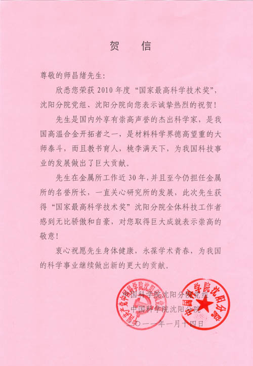 2011年1月14日,沈陽(yáng)分院向中國(guó)科學(xué)院金屬研究所名譽(yù)所長(zhǎng)師昌緒院士發(fā)去賀信,祝賀他榮獲2010年度國(guó)家最高科學(xué)技術(shù)獎(jiǎng)。