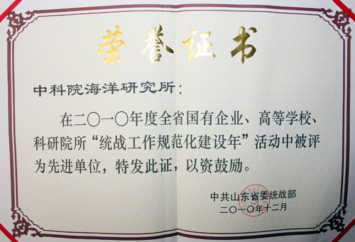 日前,山東省委統(tǒng)戰(zhàn)部長(zhǎng)會(huì)議在濟(jì)南召開(kāi),山東省內(nèi)各市委統(tǒng)戰(zhàn)部長(zhǎng),各大企業(yè)高校、科研院所黨委統(tǒng)戰(zhàn)部長(zhǎng)、省宗教局、省工商聯(lián)有關(guān)負(fù)責(zé)人等180余人參加會(huì)議,會(huì)議對(duì)全省統(tǒng)戰(zhàn)工作先進(jìn)單位和先進(jìn)個(gè)人進(jìn)行了表彰。海洋所獲“2010年度山東省國(guó)有企業(yè)、高等學(xué)校、科研院所統(tǒng)戰(zhàn)工作規(guī)范化建設(shè)年活動(dòng)先進(jìn)單位”榮譽(yù)稱(chēng)號(hào),全省獲此項(xiàng)榮譽(yù)的單位共有 21個(gè),海洋所是受表彰的兩個(gè)科研院所之一。