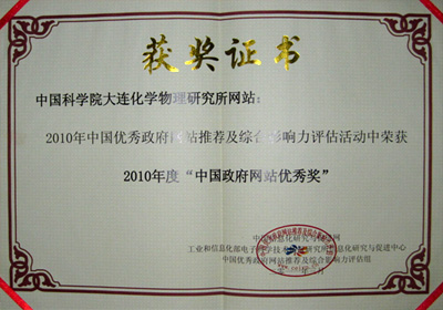 會(huì)上表彰了獲得2010年度各種榮譽(yù)獎(jiǎng)項(xiàng)的單位,中科院大連化學(xué)物理研究所網(wǎng)站獲得了2010年度“中國(guó)政府網(wǎng)站優(yōu)秀獎(jiǎng)”。