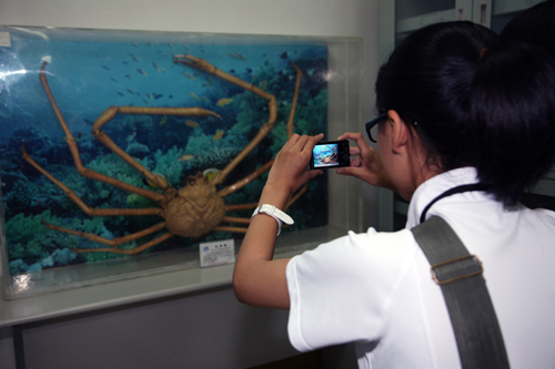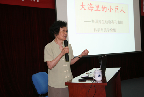 鄭守儀院士為小記者們作了題為“大海中的小巨人——有孔蟲”科普?qǐng)?bào)告,并現(xiàn)場(chǎng)展示了有孔蟲模型,指導(dǎo)小記者們利用顯微鏡觀察有孔蟲標(biāo)本。小記者們還參觀了中科院海洋生物標(biāo)本館。