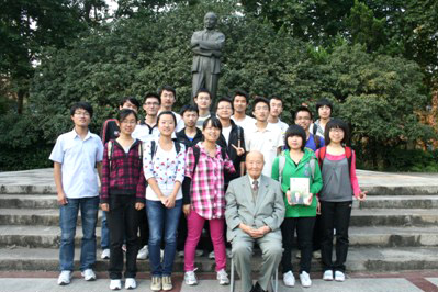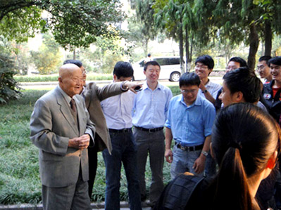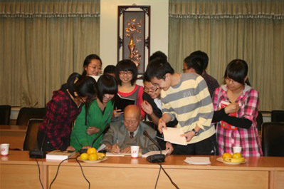 23日下午,師先生與師昌緒材料科技英才班的同學(xué)和老師代表進行了座談,座談會由陳初升副校長主持。師先生從材料學(xué)科的特點和發(fā)展趨勢談起,指出材料研究就是要面向國家需要,發(fā)展能真正用得上的新材料,必須與技術(shù)、工程相結(jié)合才能發(fā)揮其功效,才能變成財富。他鼓勵同學(xué)們要熱愛專業(yè)、學(xué)好本領(lǐng),致力于材料科學(xué)與工程事業(yè)。座談會上,同學(xué)們積極發(fā)言,踴躍提問。從材料科學(xué)與工程的區(qū)別,到如何克服科研中的急躁情緒做出原始創(chuàng)新的工作,從中美科研的比較到如何看待留學(xué)等等。師先生質(zhì)樸而深刻的回答,不時贏得同學(xué)們的陣陣掌聲。師先生還向英才班的師生贈送了自傳《在人生道路上》一書,并在封面上欣然題詞:“祝愿材料英才班同學(xué)努力學(xué)習(xí),認真工作,充分發(fā)揮自己的智慧與能力,為中華民族的振興而努力奮斗”。
