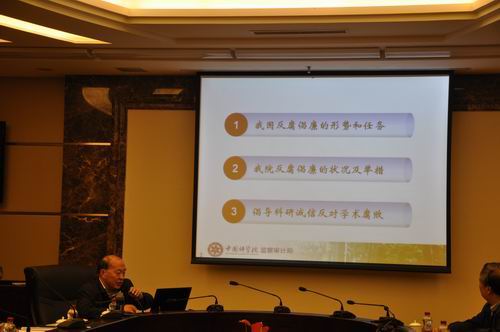 院監(jiān)審局局長李定作了題為《居安思危,防微杜漸,為“創(chuàng)新2020”保駕護(hù)航》的專題報告,從我國反腐倡廉的形勢和任務(wù)、我院反腐倡廉的狀況及舉措、倡導(dǎo)科研誠信反對學(xué)術(shù)腐敗三個方面,并結(jié)合近幾年社會上以及我院發(fā)生的具體案件,給大家上了一堂生動的反腐倡廉教育課。
