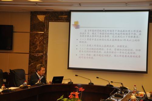 沈陽分院黨組書記馬思以《領(lǐng)導(dǎo)班子建設(shè)有關(guān)情況介紹及思考》為題,從院領(lǐng)導(dǎo)班子建設(shè)的有關(guān)規(guī)定、研究所領(lǐng)導(dǎo)班子換屆(屆中)考核工作流程與要求、后備干部的選拔與培養(yǎng)、領(lǐng)導(dǎo)干部報告?zhèn)€人有關(guān)事項(xiàng)等四個方面,介紹了我院關(guān)于領(lǐng)導(dǎo)班子建設(shè)和后備干部選派與培養(yǎng)的工作流程及相關(guān)要求,并對相關(guān)工作提出了具體的思考和建議。