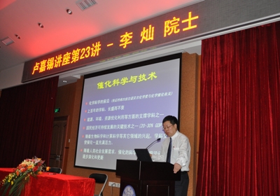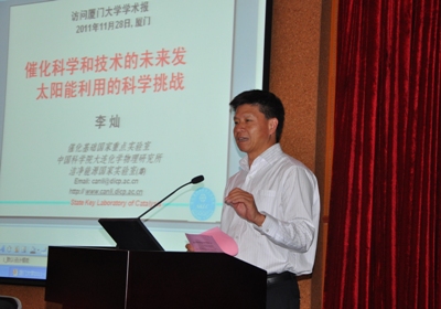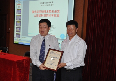 在隨后由廈門大學(xué)化學(xué)化工學(xué)院舉辦的“盧嘉錫講座”上,李燦院士做了題為“催化科學(xué)和技術(shù)的未來發(fā)展及太陽能利用的科學(xué)挑戰(zhàn)”的學(xué)術(shù)報(bào)告。大連化物所包信和院士在出席“第十六屆全國光散射學(xué)術(shù)會議”和“第三屆亞洲光譜學(xué)會議”期間,也應(yīng)邀為 “盧嘉錫講座”作了題為“促進(jìn)能源可持續(xù)發(fā)展的催化科學(xué)和技術(shù)”的學(xué)術(shù)報(bào)告。兩場報(bào)告吸引了近600人參加。為了慶祝廈門大學(xué)建校90周年,李燦院士欣然題詞“高山仰止,止于至善”,并代表大連化物所對廈門大學(xué)建校90周年表示熱烈祝賀。