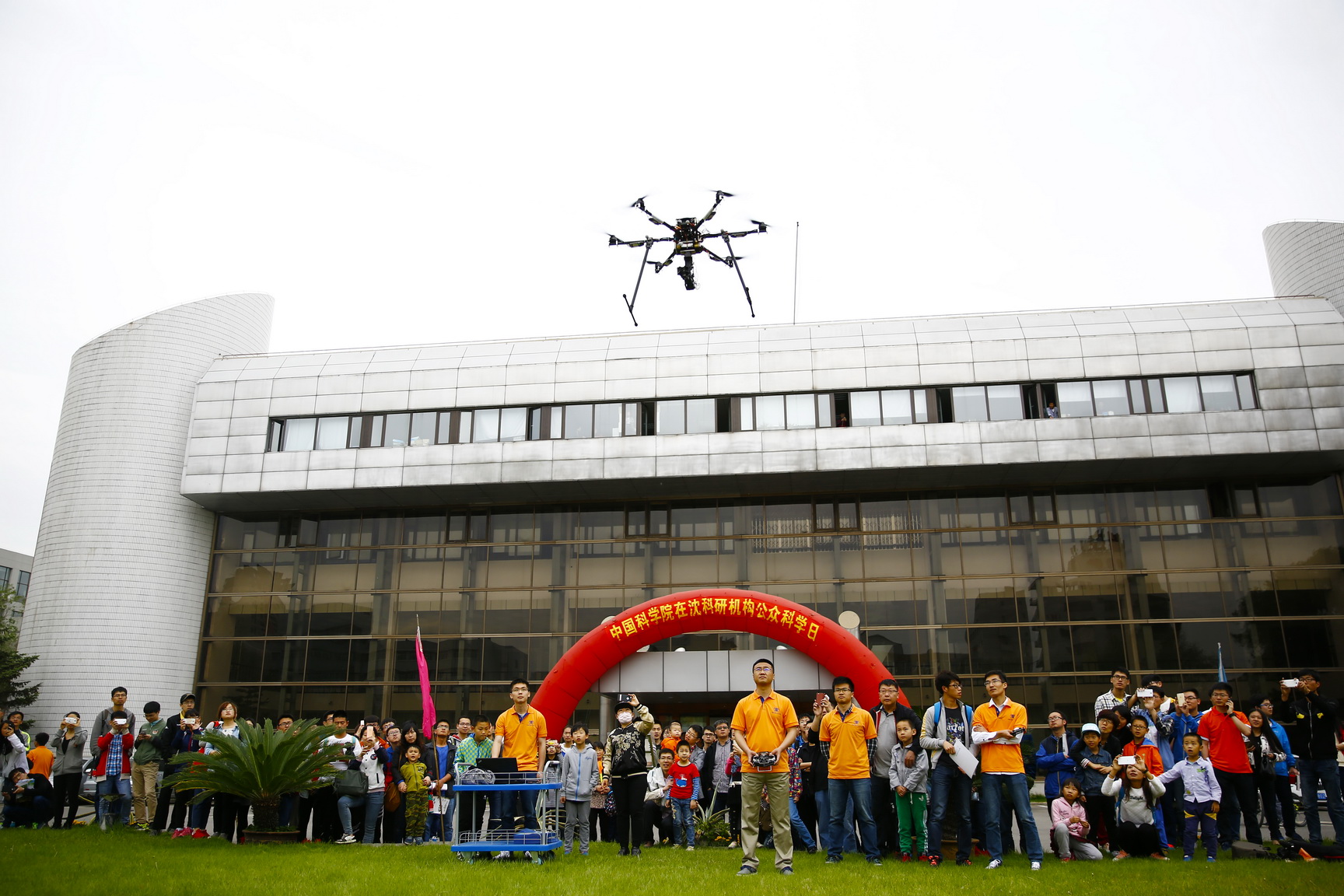 啟動(dòng)儀式后,在沈陽(yáng)自動(dòng)化所園區(qū)花壇舉行了一場(chǎng)飛行表演。研究所的六軸飛行器擔(dān)任了這次表演的主角。在志愿者操作下,飛行器穩(wěn)穩(wěn)地飛了起來,在空中旋繞飛行。參觀者興趣高昂,將花壇團(tuán)團(tuán)圍住,興致勃勃地觀看這場(chǎng)表演。