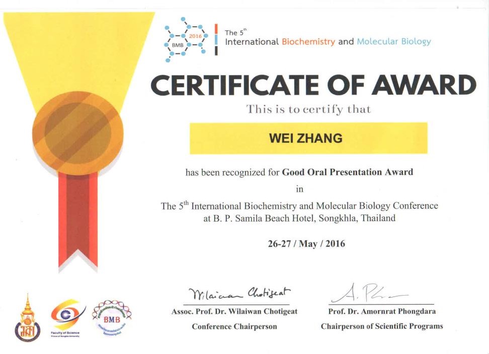 張偉的口頭報告取得了較好的反響,并被評為該次大會的“優(yōu)秀口頭報告”。與會期間,張偉和參會代表在生物化學(xué)、分子生物學(xué)、酶工程等生物化學(xué)和技術(shù)領(lǐng)域進(jìn)行了探討交流,與泰國宋卡王子大學(xué)分子生物技術(shù)與生物信息學(xué)系教授Amornrat Phongdara、化學(xué)系教授Vatcharin Rukachaisirikul及泰國國家癌癥中心的Danai Tiwawech教授達(dá)成了初步合作意向。通過本次會議,進(jìn)一步增強和擴大了酶工程團(tuán)隊及研究所的國際影響力和知名度。