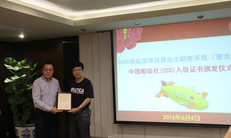中國(guó)船級(jí)社向沈陽自動(dòng)化所頒發(fā)“潛龍二號(hào)”入級(jí)證書