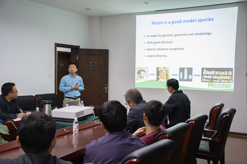 嚴(yán)建兵教授介紹了玉米在世界各地的種植分布情況,指出玉米作為主要糧食經(jīng)濟(jì)作物和模式植物研究的重要性和必要性,詳細(xì)介紹了其實驗室在玉米重要種質(zhì)資源收集和玉米基因組學(xué)研究方面的工作,并與科研人員分享了其團(tuán)隊利用玉米自交系群體,通過全基因組關(guān)聯(lián)分析(GWAS)解析影響玉米籽粒發(fā)育、油脂積累和其他重要代謝物合成等遺傳學(xué)基礎(chǔ)的經(jīng)驗和成果。報告結(jié)束后,嚴(yán)教授還與現(xiàn)場的科研人員進(jìn)行了親切交流,并結(jié)合自身科研經(jīng)歷和經(jīng)驗,與大家探討了如何發(fā)現(xiàn)科學(xué)問題,如何做好科研工作和如何培養(yǎng)科研合作精神等熱點問題。