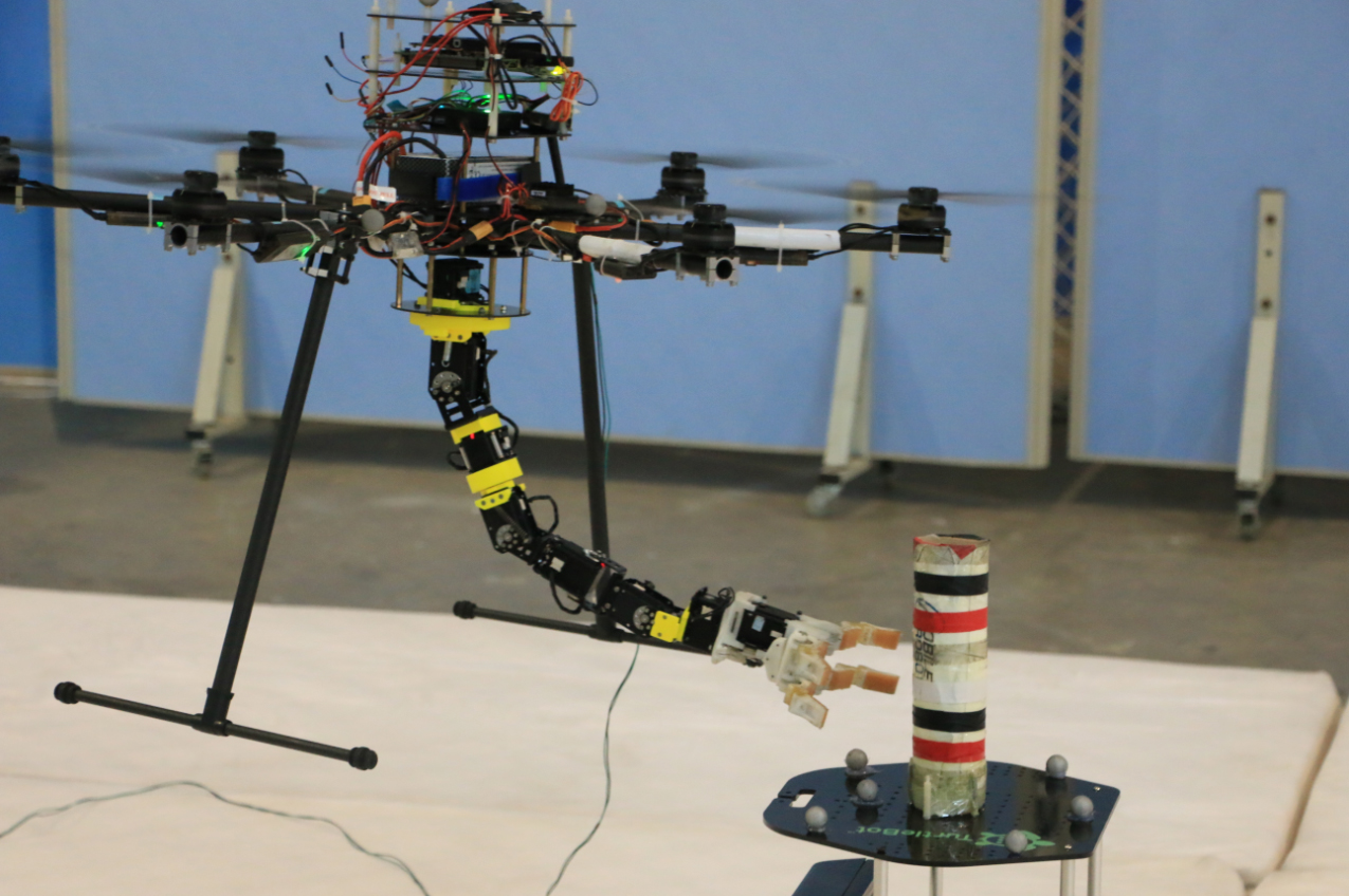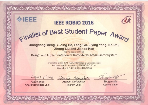 此次分會邀請了來自韓國釜山大學、新西蘭奧克蘭大學、大連理工大學等國內外相關領域的專家,共同交流研究成果。旋翼飛行機械臂是在現有旋翼飛行機器人上安裝多自由度操作手臂構成的一種新型機器人系統,與會專家針對旋翼飛行機械臂的相關研究進行了深入的學術討論。沈陽自動化所自主機器人課題組博士研究生孟祥冬、張廣玉展示了研究所在該方向上的最新研究進展,即實現了旋翼飛行機械臂對運動目標物的精準捕獲。其中,孟祥冬等撰寫的論文Design and Implementation of Rotor Aerial Manipulator System獲得ROBIO 2016會議“最佳學生論文”提名獎(Finalist of Best Student Paper Award)。
