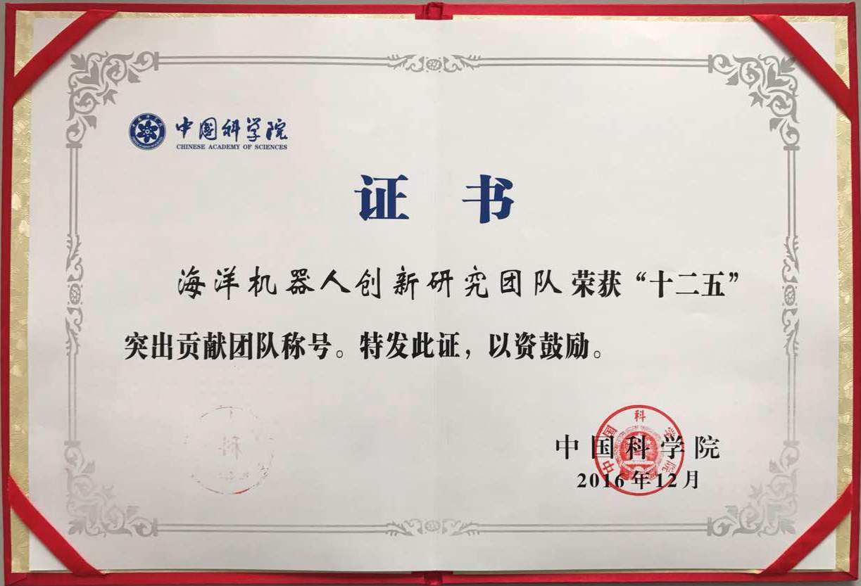 “中科院突出貢獻團隊”由各分院推選候選團隊,院人事局組織評選,并經公示和院長辦公會審定,旨在表彰“十二五”期間在“三個面向”方面取得突破性重大科研成果,在本研究領域有較大影響力,人才培養(yǎng)、團隊建設成效顯著,團隊結構合理,成員信念堅定、素質優(yōu)良的科研團隊。(海洋信息技術裝備中心、水下機器人研究室)