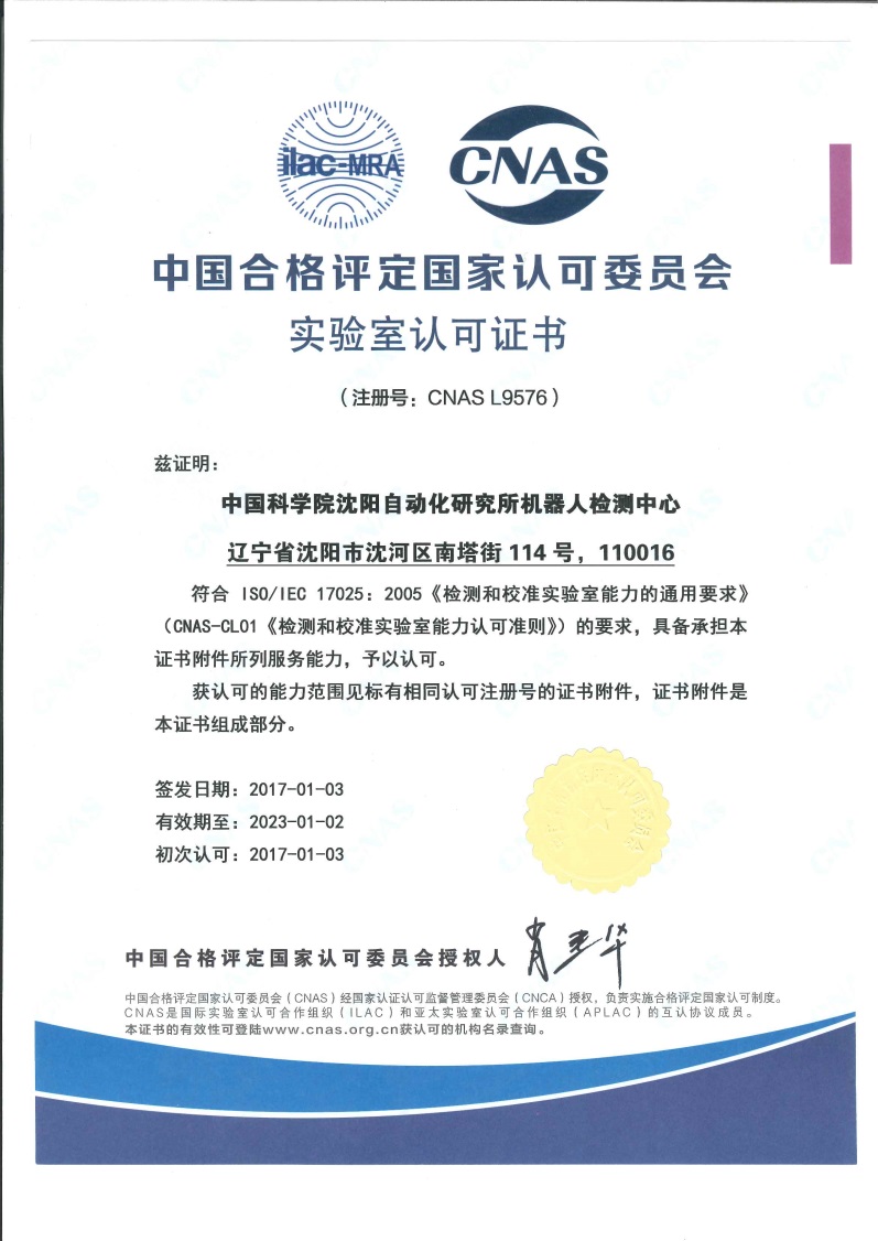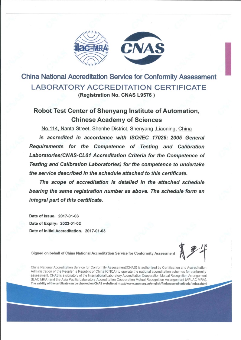 1月3日,中國合格評定國家認(rèn)可委員會批準(zhǔn)了中國科學(xué)院沈陽自動化研究所機器人檢測中心的CNAS認(rèn)可資格,并簽發(fā)了CNAS實驗室認(rèn)可證書,證書注冊號:CNAS L9576。該證書的簽發(fā)標(biāo)志著中心符合ISO/IEC 17025:2005《檢測和校準(zhǔn)實驗室能力的通用要求》(CNAS-CL01《檢測和校準(zhǔn)實驗室能力認(rèn)可準(zhǔn)則》)的要求,已具備按照認(rèn)可準(zhǔn)則開展機器人產(chǎn)品檢測的技術(shù)能力,獲得了對外出具加蓋CNAS認(rèn)可標(biāo)識檢測報告的資質(zhì)。檢測報告具有社會公信力,并能獲得國際上已簽署互認(rèn)協(xié)議的國家和地區(qū)的承認(rèn)。