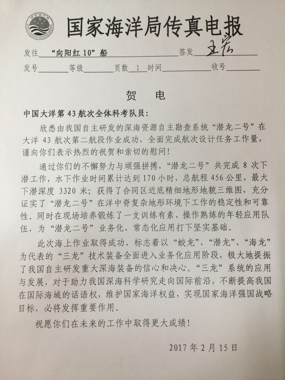 “潛龍二號”作為“十二五”國家“863”計劃“深海潛水器技術(shù)與裝備”重大項(xiàng)目的課題,由中國大洋協(xié)會辦公室牽頭,沈陽自動化所為技術(shù)總體單位,聯(lián)合國家海洋局第二海洋研究所等單位共同研制。2016年6月4日,“潛龍二號”正式獲得CCS入級證書,成為我國第一臺入級的無人潛水器。2016年6月30日,課題在北京通過了863海洋技術(shù)領(lǐng)域辦組織的驗(yàn)收。2017年2月7日,“潛龍二號”圓滿完成中國大洋43航次科考應(yīng)用任務(wù)。2月15日,國家海洋局黨組書記、局長王宏簽發(fā)賀電,祝賀“潛龍二號”在大洋43航次第二航段作業(yè)成功。