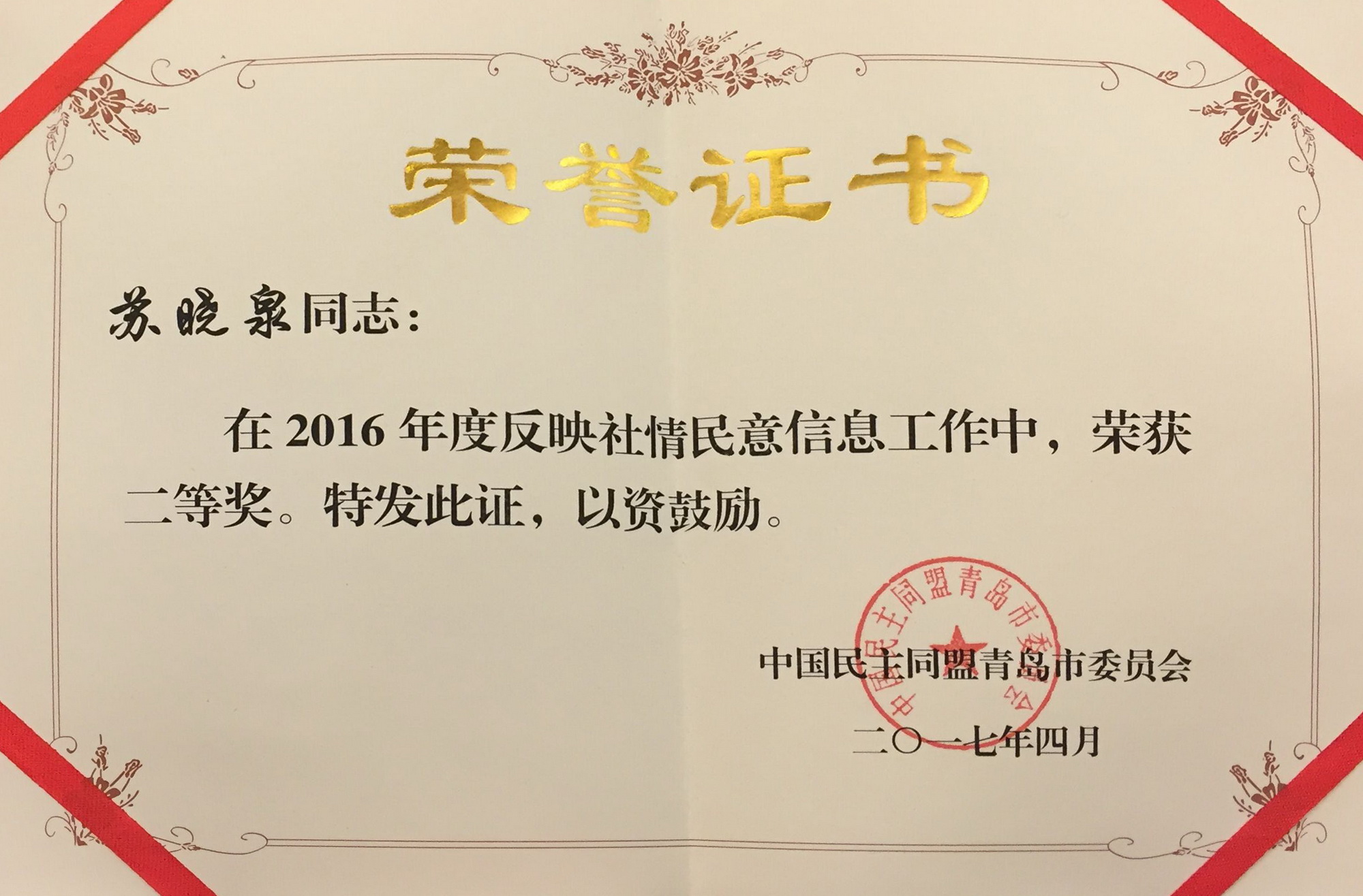 近日,民盟青島市委召開了2017年參政議政工作會(huì)議,對2016年度參政議政工作和反映社情民意信息工作先進(jìn)集體、先進(jìn)個(gè)人作出表彰,青島能源所蘇曉泉榮獲民盟青島市委2016年度反映社情民意信息工作先進(jìn)個(gè)人二等獎(jiǎng)。