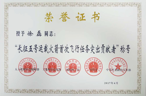 徐磊研究員獲“長征五號運載火箭首次飛行任務(wù)突出貢獻(xiàn)者”榮譽稱號。
