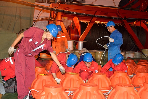 燈光下準(zhǔn)備有線實(shí)時(shí)化潛標(biāo)布放