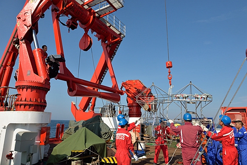 離開青島,一路向南。太陽越來越熾烈,推開到甲板的艙門,一股熱浪襲面而來。烈日下的后甲板已經(jīng)開始忙碌。利用航渡間隙,工程技術部主任孫宇峰正帶領技術人員在后甲板進行吊裝,為即將開始的作業(yè)任務做前期準備。