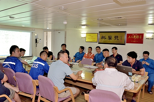 上午九點,船長劉合義召集各主要負責人在“科學”號四樓會議室召開了航次工作協(xié)調會。首席科學家俞建成研究員對第一航段作業(yè)任務計劃做了詳細介紹。船長劉合義、首席科學家俞建成、作業(yè)隊長王昊、工程技術部主任孫宇峰與設備相關負責人圍繞具體工作,從設備的布放和回收、與船舶的配合、人員分工部署等方面進行了詳細討論,確保船舶、設備和人員安全,保障作業(yè)任務順利完成。劉合義船長強調,海上科考工作難度高,突發(fā)情況多,工作中既要各司其職、各負其責,又要相互團結協(xié)作、加強溝通協(xié)調,合作才能共贏。