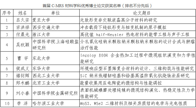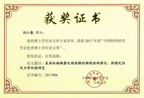 近期,中國材料研究學(xué)會(huì)組織開展了首屆C-MRS材料學(xué)科優(yōu)秀博士論文評(píng)選工作。共有23個(gè)會(huì)員單位的46篇論文參評(píng),最終評(píng)選出10篇論文作為首屆C-MRS材料學(xué)科優(yōu)秀博士論文(排名不分先后)。我所2015年博士畢業(yè)生劉小春(導(dǎo)師盧柯、張洪旺)獲首屆C-MRS材料學(xué)科優(yōu)秀博士論文獎(jiǎng)。2017年7月9日在中國材料大會(huì)2017暨銀川國際材料周開幕式上,中國材料研究學(xué)會(huì)副理事長(zhǎng)韓高榮、聶祚仁、潘復(fù)生、翁端、謝建新、楊銳、姚燕、張平祥、朱美芳為“優(yōu)秀博士學(xué)位論文獎(jiǎng)”獲獎(jiǎng)?wù)哳C獎(jiǎng)。