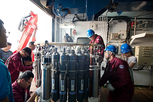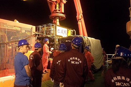科考隊員在ROV回收成功后等待著生物樣品和沉積物樣品