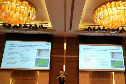 會議主席由國家“973”項目首席科學(xué)家、中國科學(xué)院核用材料與安全評價重點實驗室主任韓恩厚研究員和骨干吳欣強研究員擔任。來自國內(nèi)外共計30余家單位的147位代表參加了此次研討會。美國工程院院士Peter L. Andresen博士、歐盟腐蝕協(xié)會主席Damien Feron、芬蘭國家技術(shù)研究中心首席科學(xué)家Ulla Ehrnsten、上海發(fā)電設(shè)備成套設(shè)計研究院總工竇一康、日本東北大學(xué)Yutaka Watanabe教授和環(huán)境促進開裂國際合作組織主席Tsung-Kuang Yeh教授以及來自美國GE全球研究中心、美國ISOFLEX、英國牛津大學(xué)、瑞典Sandvik、芬蘭VTT、芬蘭CORMET、日本東北大學(xué)、日本東京工業(yè)大學(xué)、日本原子能協(xié)會、日本應(yīng)用能源研究所、日本日立公司、日本東芝公司、日本三菱化學(xué)、韓國高等科技院、韓國原子能研究院、韓國蔚山國立科學(xué)技術(shù)研究所等本領(lǐng)域有重要影響的40多名海外專家出席了本次會議。國內(nèi)的參會代表主要來自核電設(shè)計單位、設(shè)備制造單位、核電廠、電站監(jiān)管單位以及相關(guān)研究所和大學(xué)。大會共計收到100余篇論文,包括大會特邀報告5篇、分會邀請報告10篇、分會口頭報告40余篇及墻報30余篇。會議期間,與會代表圍繞“核電廠運行水化學(xué)操作經(jīng)驗與腐蝕”、“核電廠材料和可靠性”、“水化學(xué)和流動加速腐蝕”、“水化學(xué)和燃料性能”、“模擬和監(jiān)測技術(shù)”、“輻射緩解與去污技術(shù)”、“輔助系統(tǒng)及將來技術(shù)”、“核系統(tǒng)材料老化問題”等8個主要議題進行了深入的交流和討論。