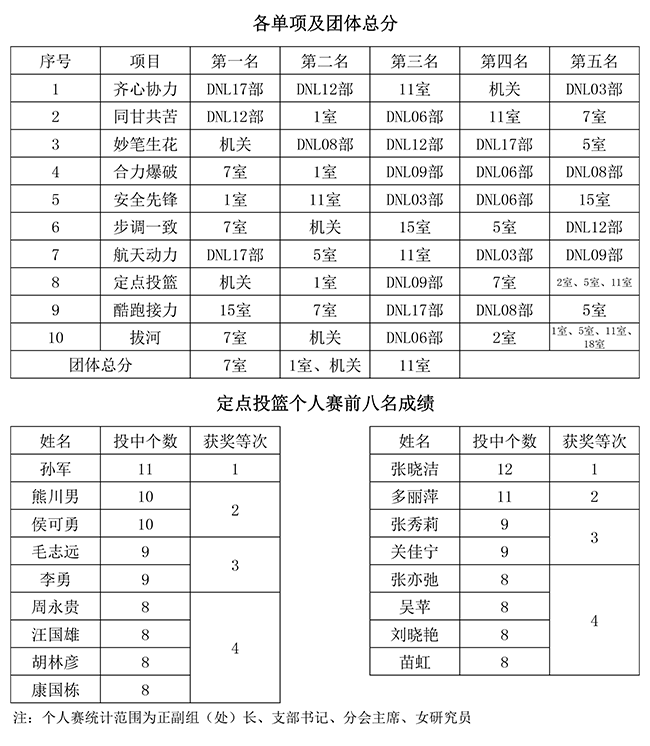 在接近四個(gè)小時(shí)的活動中,大家全身心投入其中。在各個(gè)項(xiàng)目比賽中,各工會分會積極調(diào)兵遣將,廣大參賽人員服從指揮,展現(xiàn)了高度的組織性、紀(jì)律性和較強(qiáng)的團(tuán)隊(duì)協(xié)作精神以及良好的精神風(fēng)貌。特別是在集體拔河比賽中,場上運(yùn)動員鼓足了干勁、全力拼搏,場下助威團(tuán)也憋紅了臉、忘情吶喊。此起彼伏的歡呼聲、加油聲沸騰了運(yùn)動現(xiàn)場,也拉緊了大家心中“團(tuán)隊(duì)精神”這根繩。隨著7室拔河隊(duì)?wèi){借強(qiáng)大的實(shí)力和充分的準(zhǔn)備,以壓倒性的優(yōu)勢獲得拔河比賽冠軍,嘉年華活動也接近了尾聲。最終各單項(xiàng)及團(tuán)體總分獲獎(jiǎng)情況如下: