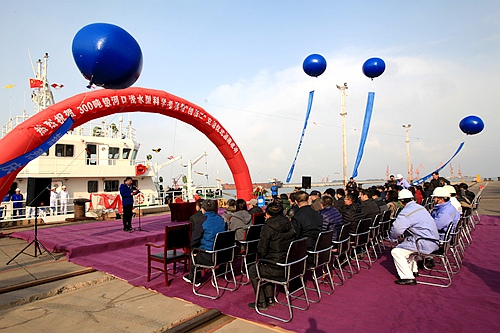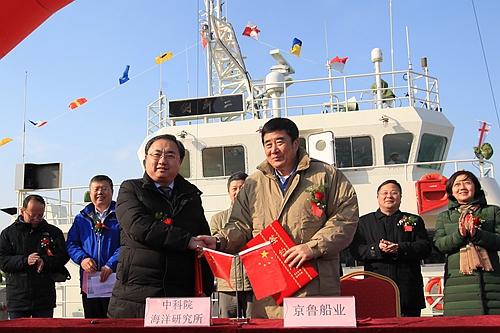 中科院條件保障與財(cái)務(wù)局高級(jí)工程師張紅松、蓬萊中柏京魯船業(yè)有限公司董事長(zhǎng)王轟、中國(guó)科學(xué)院海洋研究所所長(zhǎng)王凡分別致辭,中科院海洋所黨委書(shū)記王輝主持儀式。