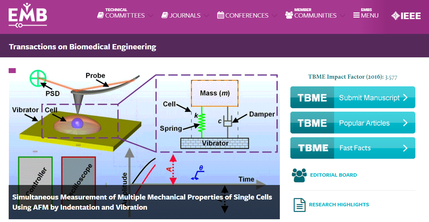 近日,國際著名學(xué)術(shù)雜志IEEE Transactions on Biomedical Engineering(中科院二區(qū)期刊)以亮點(diǎn)論文的形式發(fā)表了中國科學(xué)院沈陽自動(dòng)化研究所微納米課題組在類生命機(jī)器人領(lǐng)域取得的最新成果(Simultaneous Measurement of Multiple Mechanical Properties of Single Cells Using AFM by Indentation and Vibration, 2017, 64(12): 2771-2780. https://tbme.embs.org/)。