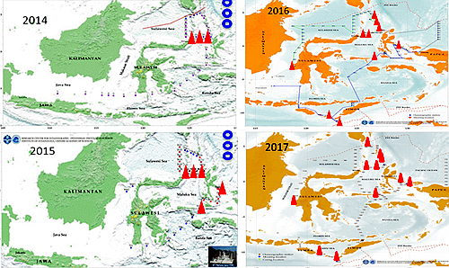 自2014年以來,中國科學院海洋所與印尼科學院海洋研究中心每年在印尼海開展聯(lián)合海上調(diào)查航次,迄今已成功實施4個航次(2014-2017),積累了大量寶貴數(shù)據(jù)和經(jīng)驗。通過4個聯(lián)合航次,成功取回了布放在馬魯古海峽的深海潛標,歷史上第一次獲得了馬魯古海上層海洋環(huán)流的長時序測流數(shù)據(jù),事件覆蓋整個2014-2016年厄爾尼諾事件的發(fā)展過程。2017年回收了在哈馬黑啦海、利法馬托拉海峽、望加錫海峽、薩武海、帝汶海布放了一年的10套深海潛標,并新布放了10套深海潛標,這對研究印度洋環(huán)流受印尼海環(huán)流影響有重要的科學意義。目前中國科學院海洋研究所與印尼科學院海洋研究中心的印尼海國際合作調(diào)查已經(jīng)成為歷史上規(guī)模最大的印尼海觀測計劃,可與歷史上的國際海洋觀測計劃,包括Arlindo和INSTANT等,形成良好互補。