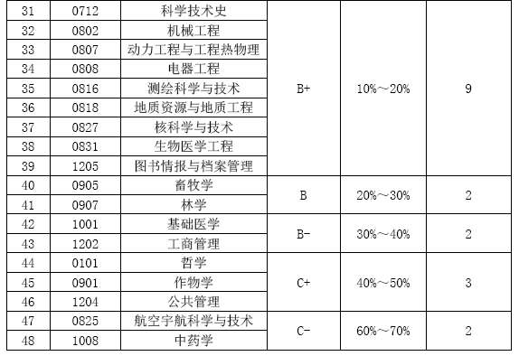 與前幾輪學(xué)科評估不同的是,本輪學(xué)科評估結(jié)果采用按百分位進(jìn)行分檔的方式,根據(jù)“學(xué)科整體水平得分”的位次百分位,將前70%的學(xué)科分為9檔公布,不公布分?jǐn)?shù)且不排具體名次,僅公布排位前70%的學(xué)科。其中,前2%(或前2名)為A+,2%~5%為A(不含2%,下同),5%~10%為A-,10%~20%為B+,20%~30%為B,30%~40%為B-,40%~50%為C+,50%~60%為C,60%~70%為C-。