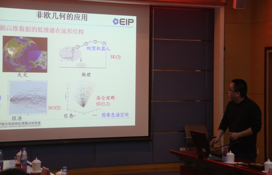 重點(diǎn)實(shí)驗(yàn)室主任史澤林研究員總結(jié)匯報(bào)了一年來(lái)的總體運(yùn)行情況,重點(diǎn)介紹了實(shí)驗(yàn)室在信息光電子學(xué)、計(jì)算成像、智能信息處理及新體制應(yīng)用等方向上取得的學(xué)術(shù)進(jìn)展,匯報(bào)了實(shí)驗(yàn)室面向國(guó)家戰(zhàn)略需求、面向本領(lǐng)域科技前沿所做的未來(lái)設(shè)想與布局。朱楓研究員、劉云鵬研究員分別作了“智能感知研究及應(yīng)用的考慮”、“基于非歐幾何的目標(biāo)識(shí)別與跟蹤方法”學(xué)術(shù)報(bào)告。