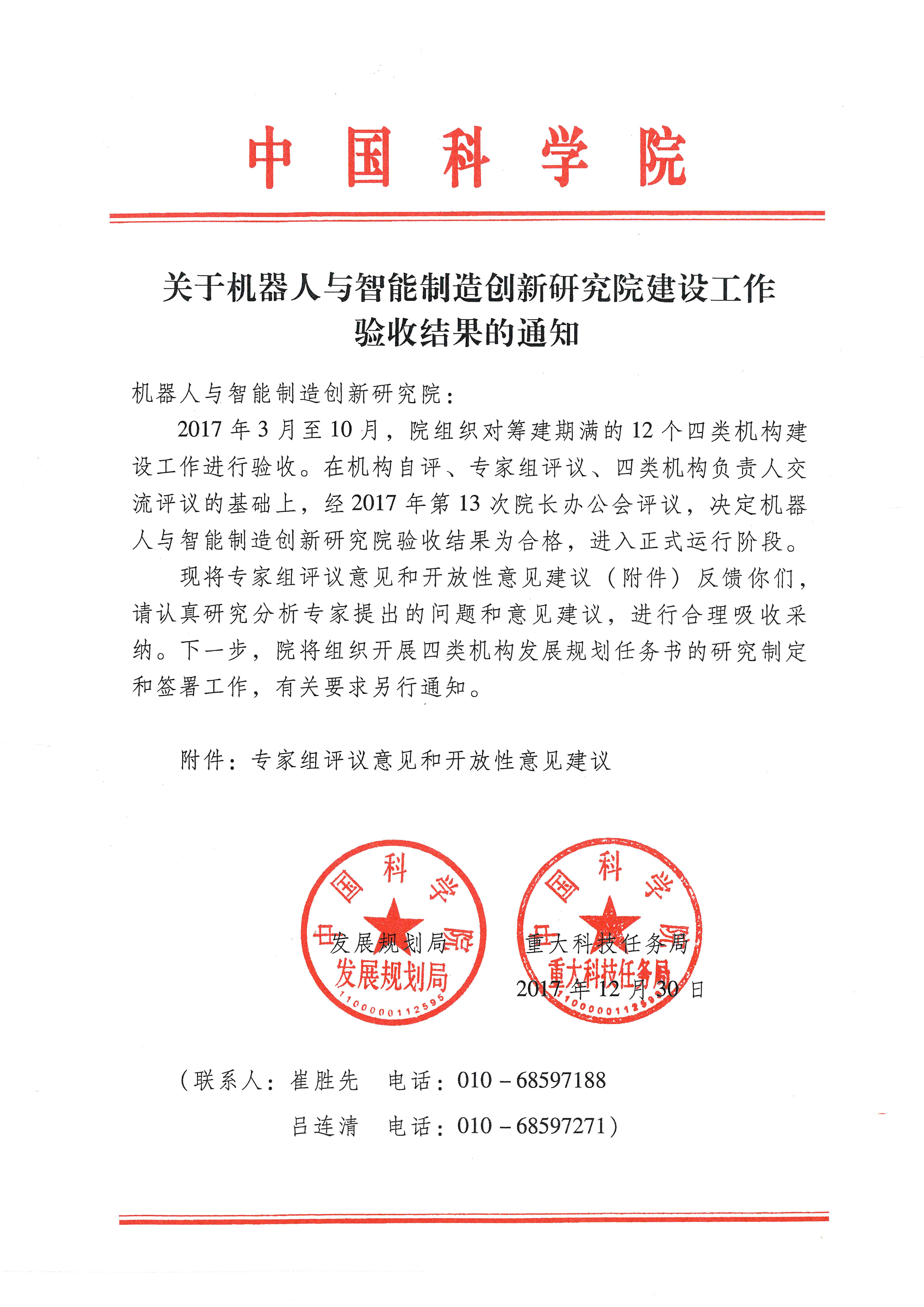2017年10月11日,中國科學(xué)院機(jī)器人與智能制造創(chuàng)新研究院建設(shè)試點(diǎn)工作專家組驗(yàn)收會舉行,籌建組組長于海斌匯報(bào)了創(chuàng)新研究院籌建工作情況。中科院副院長相里斌在驗(yàn)收會上指出“創(chuàng)新研究院定位準(zhǔn)確,領(lǐng)域方向布局合理。機(jī)器人創(chuàng)新院全面完成籌建期目標(biāo)”。近日,經(jīng)院長辦公會評議,決定創(chuàng)新研究院通過驗(yàn)收,進(jìn)入正式運(yùn)行階段。