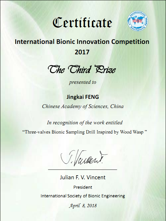 近日,國(guó)際仿生工程學(xué)會(huì)(International Society of Bionic Engineering)首屆研究生仿生創(chuàng)新大賽評(píng)選結(jié)果揭曉,中國(guó)科學(xué)院沈陽(yáng)自動(dòng)化研究所研究生馮靖凱參賽作品Three-valves Bionic Sampling Drill Inspired by Wood Wasp獲三等獎(jiǎng)。