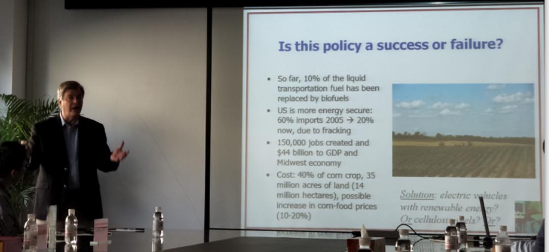5月10日,美國工程院院士Jerald L. Schnoor教授出席青島能源所“國際專家高層論壇”。Schnoor教授是美國愛荷華大學土木與環(huán)境工程學系、職業(yè)與環(huán)境健康學系教授,Allen S. Henry講座教授,中國科學院愛因斯坦講座席教授,美國國家基金會21世紀環(huán)境保護科學委員會主席,全球與地區(qū)環(huán)境研究中心主任。本次論壇由研究所科技處處長梁向峰主持,并為Schnoor教授頒發(fā)了“國際專家高層論壇”榮譽獎牌。 Schnoor教授帶來了題為“Biofuel and Cellulosic Biofuel in Iowa and the U.S.”的學術報告。他指出了生物燃料和EPA可持續(xù)發(fā)展燃料標準(RFS2)發(fā)展現(xiàn)狀及面臨的挑戰(zhàn),認為原油市場競爭力加劇、生物燃料生產(chǎn)技術仍存在難點等因素是導致纖維素生物燃料商業(yè)化推廣緩慢的原因。通過舉例詳細介紹了玉米原料生產(chǎn)和乙醇燃料生產(chǎn)面臨的主要問題是增加當?shù)厮Y源使用量,并產(chǎn)生水資源及大氣污染。他認為,纖維素生物燃料由于低環(huán)境污染等優(yōu)勢,在“應用糧食作物生產(chǎn)乙醇燃料”的領域會有更加廣闊的前景。報告結束后,參會人員就相關學術問題與Schnoor教授進行了探討和交流。