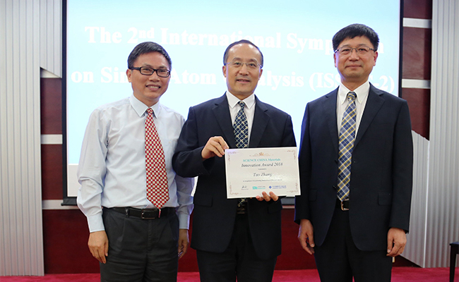 6月18日,首屆“中國科學材料 創(chuàng)新獎(Science China Materials Innovation Award)”揭曉,中國科學院大連化學物理研究所張濤院士因其“在工業(yè)催化材料研究領域的突出貢獻,特別是在單原子催化方面的開創(chuàng)性研究”成為該獎項的首位獲獎者。國家自然科學基金委員會副主任張希教授和Science China Materials主編李亞棟教授在第二屆單原子催化國際研討會(The 2nd International Symposium on Single-Atom Catalysis)期間向張濤頒發(fā)了獲獎證書。