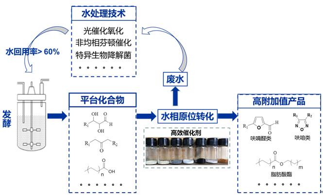 針對(duì)發(fā)酵產(chǎn)物分離精制加工成本高的問題,青島能源所生物基材料組群馮德鑫研究組提出發(fā)酵產(chǎn)品水相原位轉(zhuǎn)化技術(shù)。區(qū)別于傳統(tǒng)分離精制過程的最大特點(diǎn)是原位轉(zhuǎn)化不需要對(duì)發(fā)酵產(chǎn)物進(jìn)行分離提純直接進(jìn)行衍生化制備得到高附加值化學(xué)品。本研究組通過合成多種固體酸復(fù)合催化劑替代傳統(tǒng)高污質(zhì)子酸催化劑,將發(fā)酵液中單糖、酮、長(zhǎng)鏈羧酸等生物基產(chǎn)品原位轉(zhuǎn)化為呋喃類化合物、呋咱類化合物和生物柴油等,原料轉(zhuǎn)化率均可達(dá)到90%以上,從而實(shí)現(xiàn)水相條件下高效綠色轉(zhuǎn)化。相關(guān)成果已申請(qǐng)專利10篇,發(fā)表論文5篇。