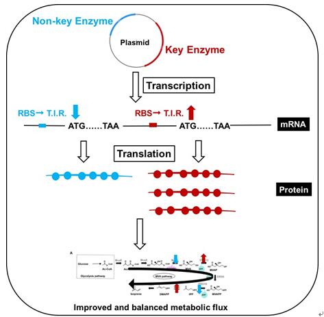 青島能源所生物基材料組群張海波研究員帶領(lǐng)的精細(xì)化學(xué)品研究組長期致力于萜烯化合物的生物合成,重點針對MVA途徑的酶甲羥戊酸激酶(MK)、異戊烯焦磷酸異構(gòu)酶(IDI)和萜烯合成酶等幾個限制性點,同時統(tǒng)籌代謝流和中間產(chǎn)物毒性,平衡整條合成路線,在點線結(jié)合提升萜類化合物合成的MVA途徑的效率上取得了新的突破。首先,針對MVA途徑中的MK和IDI,通過不同物種來源篩選、隨機(jī)突變和半理性設(shè)計進(jìn)行定向進(jìn)化和優(yōu)化,獲得了酶活性提高的MK(RSC Advances, 2018)和IDI (Microbial Cell Factories, 2018),從而減弱代謝流在MK和IDI位點的阻滯,最終提高萜烯化合物的產(chǎn)量(圖1 MK的定向進(jìn)化策略和效果圖)。其次,統(tǒng)籌MVA途徑涉及到的多步反應(yīng),對酶表達(dá)量的調(diào)控涉及的多個水平。該研究選取翻譯水平上的調(diào)控方法,避免了RNA的不穩(wěn)定和翻譯后水平調(diào)控的菌體代謝負(fù)擔(dān)問題,通過調(diào)整不同酶的核糖體結(jié)合位點(RBS)序列的手段,調(diào)控不同酶的表達(dá),平衡整條代謝路線。對非限制酶羥甲基戊二酰輔酶A還原酶基因(MvaE)和甲羥戊酸焦磷酸脫羧酶基因(ERG19),調(diào)節(jié)其RBS序列,使其翻譯起始效率(T.I.R.)降低,降低其蛋白表達(dá)量。對限制性酶MK和IDI,調(diào)節(jié)其RBS序列,使其T.I.R.提高,提高其蛋白表達(dá)量。通過對甲羥戊酸途徑中的不同的酶的蛋白表達(dá)量的調(diào)控,實現(xiàn)了代謝流的平衡,最終提高了萜烯化合物的產(chǎn)量(圖2 非限制酶和限制酶RBS序列優(yōu)化策略)。