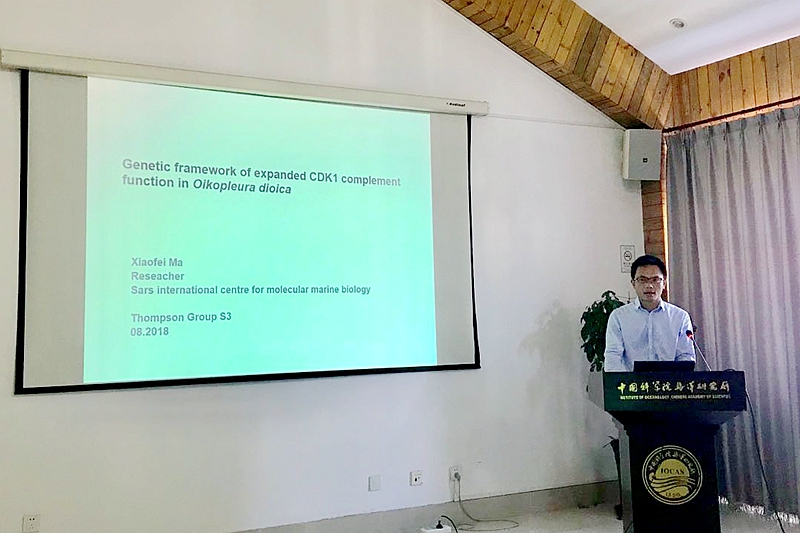在SARS國際海洋生物分子生物學中心從事博士后研究工作的馬曉飛,主要從事無脊椎動物Oikopleura dioca的細胞周期調(diào)控研究。他的報告題目是“Genetic framework of expanded CDK1 complement function in Oikopleura dioica”,介紹了其發(fā)現(xiàn)的Oikopleura CDK1獨特基因duplication,其paralogs在正達爾文選擇壓力下發(fā)生特化以促進快速胚胎分裂與發(fā)育。