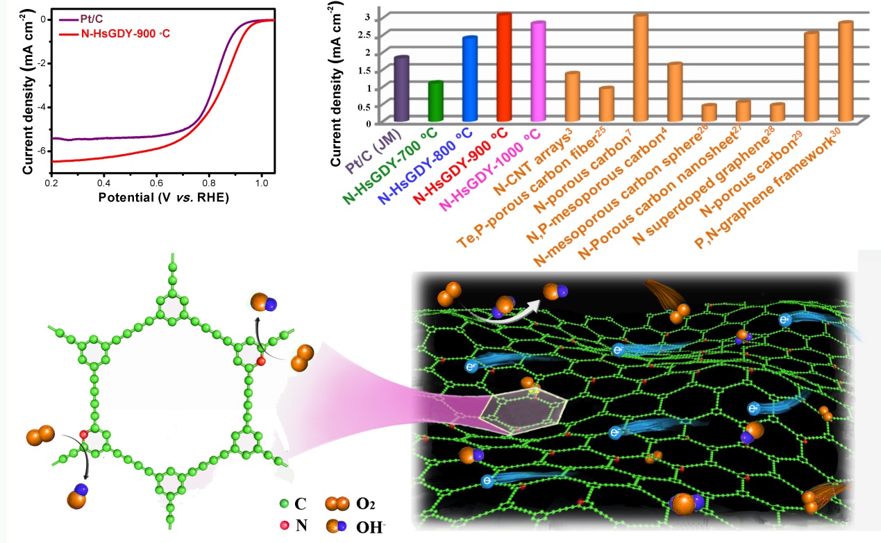 得益于HsGDY的獨(dú)特結(jié)構(gòu),在對(duì)其進(jìn)行后處理過(guò)程中,碳基材料與能源應(yīng)用研究組準(zhǔn)確控制了氮的摻入類型,選擇性摻入對(duì)燃料電池陰極電催化最有效的吡啶氮原子,從而實(shí)現(xiàn)了優(yōu)異的催化性能。同時(shí),HsGDY具有六邊形的大孔,其分子孔徑達(dá)1.63 nm,有利于催化反應(yīng)過(guò)程中反應(yīng)物和產(chǎn)物的傳質(zhì)。通過(guò)電化學(xué)測(cè)試發(fā)現(xiàn),吡啶氮摻雜的HsGDY在堿性條件下表現(xiàn)出了優(yōu)于商業(yè)碳載鉑催化劑的超高活性。其在0.85 V電位下的電流密度為商業(yè)碳載鉑催化劑的1.6倍,同時(shí)具有比碳載鉑更好的穩(wěn)定性和抗甲醇中毒能力。吡啶氮摻雜的HsGDY作為新型燃料電池陰極催化劑替代傳統(tǒng)鉑基催化劑,展現(xiàn)了巨大的潛力。這種通過(guò)碳材料結(jié)構(gòu)設(shè)計(jì),實(shí)現(xiàn)異原子的準(zhǔn)確摻雜的方法,也為制備其他摻雜型納米材料提供了新的思路。