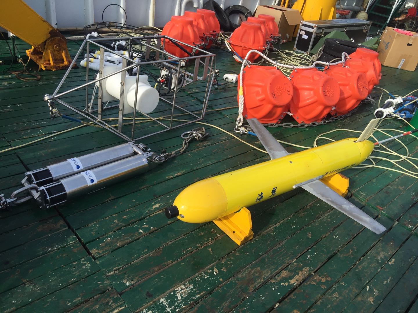 此次南海聯(lián)合試驗(yàn)由中科院沈陽(yáng)自動(dòng)化研究所與中科院深海研究所聯(lián)合開(kāi)展,參試設(shè)備包括兩臺(tái)“海翼1000”聲學(xué)水下滑翔機(jī)和一套時(shí)效潛標(biāo)。兩臺(tái)水下滑翔機(jī)對(duì)試驗(yàn)區(qū)域的海洋環(huán)境參數(shù)與聲場(chǎng)信息進(jìn)行連續(xù)精細(xì)觀測(cè),同時(shí)通過(guò)水聲通信機(jī)獲取時(shí)效潛標(biāo)的觀測(cè)數(shù)據(jù),并將數(shù)據(jù)通過(guò)衛(wèi)星通信發(fā)回岸基監(jiān)控中心。此次聯(lián)合海上試驗(yàn)的成功實(shí)施不僅拓展了“海翼”水下滑翔機(jī)的探測(cè)功能,還成功驗(yàn)證了一種移動(dòng)-固定聯(lián)合觀測(cè)作業(yè)新模式,為解決潛標(biāo)觀測(cè)數(shù)據(jù)實(shí)時(shí)化問(wèn)題提供一種全新解決途徑。