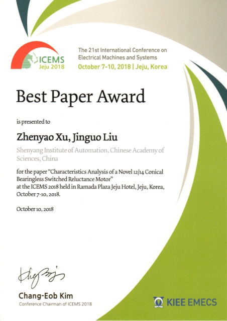 本次會議,沈陽自動化所空間自動化技術(shù)研究室徐振耀在會議上作報告,得到與會專家的好評。徐振耀與劉金國研究員合作的論文Characteristics Analysis of a Novel 12/14 Conical Bearingless Switched Reluctance Motor經(jīng)過分會主席推薦、大會委員會評審最終榮獲本次會議最佳論文獎。
