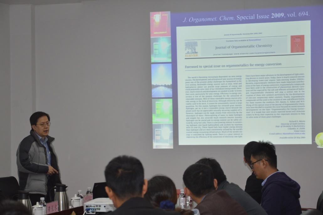 在報(bào)告中,黃維揚(yáng)詳細(xì)地介紹了具有可控光功能和電學(xué)特性的金屬有機(jī)骨架聚合物的研究進(jìn)展。重點(diǎn)介紹了該類材料在光限幅、太陽能電池和磁性數(shù)據(jù)存儲(chǔ)中的應(yīng)用。他指出通過配體官能團(tuán)的修飾實(shí)現(xiàn)主體對(duì)該類材料結(jié)構(gòu)性能的調(diào)控是目前該研究領(lǐng)域的熱點(diǎn)。報(bào)告結(jié)束后,參會(huì)人員就相關(guān)學(xué)術(shù)問題與黃維揚(yáng)進(jìn)行了探討和交流。