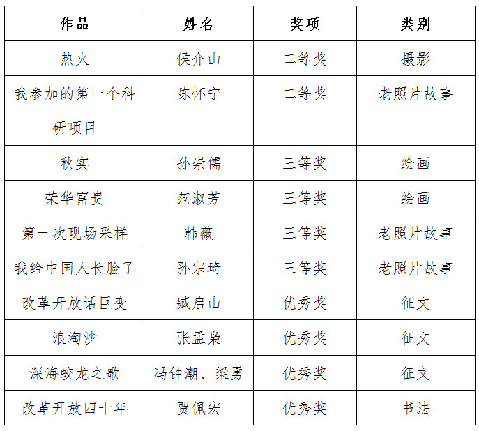 活動以紀念“科學的春天”40周年為主線,通過多種形式,聚焦改革開放和“科學的春天”40年來中科院和金屬所重大改革創(chuàng)新舉措和重大創(chuàng)新成果,展現(xiàn)新時代金屬所人的精神風貌。活動啟動以來,全所職工、研究生踴躍參與,共收到233件作品。經(jīng)黨辦初審、專家評審,評選出一等獎7個、二等獎11個、三等獎22個。