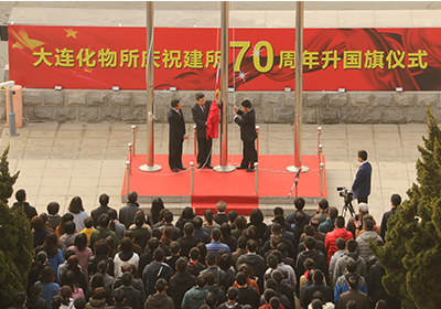 在莊嚴的國歌聲中,全國五一勞動獎章獲得者李燦院士、遼寧省先進工作者丁云杰研究員、大連市先進工作者趙宗保研究員將鮮艷的五星紅旗冉冉升起。