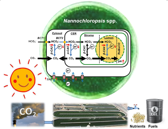 人類活動(dòng)排放的CO2等溫室氣體,導(dǎo)致了全球氣候變化和海洋酸化等重大環(huán)境和社會(huì)問(wèn)題。利用工業(yè)產(chǎn)油微藻將煙道氣等工業(yè)CO2排放源直接轉(zhuǎn)化為柴油等先進(jìn)生物燃料,對(duì)于減少溫室氣體排放、遏制全球氣候變暖具有重大的戰(zhàn)略意義。包括微藻在內(nèi)的海洋浮游植物適應(yīng)了當(dāng)前地球大氣0.04%的CO2含量,每年固定了全球CO2固定量的40%。但是,煙道氣中的CO2含量高于5%,是大氣碳含量的百倍以上。由此導(dǎo)致的培養(yǎng)環(huán)境酸化,在降低了生物污染發(fā)生幾率的同時(shí),也通常會(huì)抑制工業(yè)產(chǎn)油微藻的生長(zhǎng)與繁殖,從而大幅度降低了工業(yè)生物固碳產(chǎn)油過(guò)程的經(jīng)濟(jì)性。微擬球藻(Nannochloropsis spp.)是一種在世界各地均可室外大規(guī)模培養(yǎng)的工業(yè)產(chǎn)油微藻。它們具有生長(zhǎng)速度快、二氧化碳耐受能力強(qiáng)、海水淡水均可培養(yǎng)、遺傳操作較完善等突出優(yōu)點(diǎn)。單細(xì)胞中心魏力等研究人員,提出其利用和耐受CO2均與碳濃縮機(jī)制(Carbon Concentrating Mechanism; CCM)有關(guān)的科學(xué)假設(shè)。首先,運(yùn)用系統(tǒng)生物學(xué)思路,結(jié)合亞細(xì)胞定位等研究手段,挖掘到與高CO2應(yīng)激相關(guān)的一個(gè)關(guān)鍵靶點(diǎn),即位于細(xì)胞質(zhì)內(nèi)的一個(gè)特殊的碳酸酐酶(Carbonic anhydrase;CA2)。與5% CO2培養(yǎng)下相比,CA2在極低CO2濃度下被特異性地激活,因此是CCM系統(tǒng)感受與應(yīng)對(duì)環(huán)境中CO2濃度的關(guān)鍵基因。