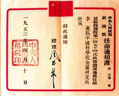 1953年4月周恩來(lái)總理簽發(fā)的任命通知書(shū)