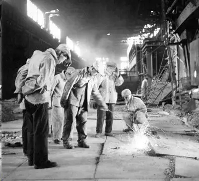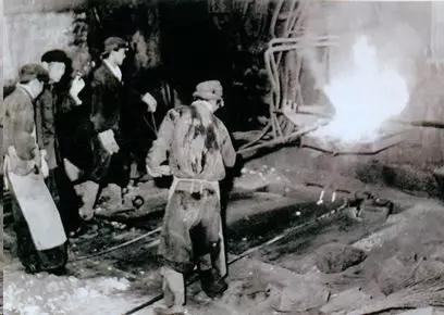 上個(gè)世紀(jì)50年代王景唐(左2)和胡壯麒在在大連鋼廠進(jìn)行氧氣煉鋼試驗(yàn)