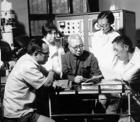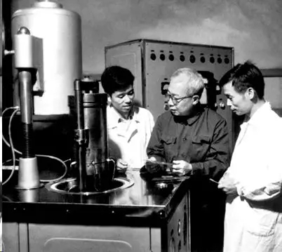 70年代初期李薰(中)在金屬所實(shí)驗(yàn)室與莊育智(右一)等討論難熔金屬的熔煉問(wèn)題