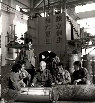 1972年8月李薰在沈陽(yáng)814廠與技術(shù)人員討論鉬合金的質(zhì)量問(wèn)題,這是我國(guó)第一顆返回式地面人造衛(wèi)星的蒙皮材料,由金屬所與814廠合作完成。