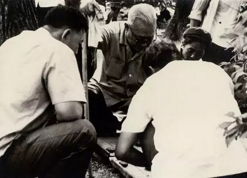 李薰先生蹲在路邊與職工下棋