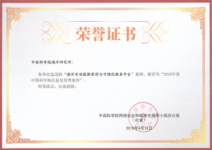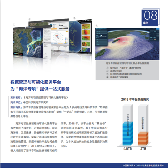 近日,中國科學院在全院范圍內開展科研信息化優(yōu)秀應用案例評選工作,中科院海洋所海洋大數(shù)據(jù)中心設計研發(fā)的“海洋先導專項數(shù)據(jù)管理與可視化平臺”被評為2018年度中國科學院科研信息化優(yōu)秀案例,并入選《中國科學院信息化年度報告(2018)》 。